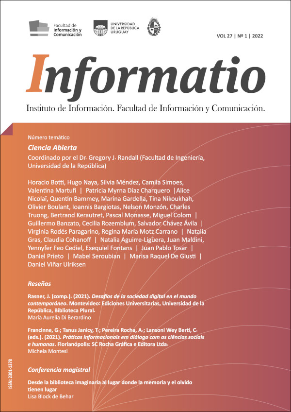 Informatio se publica en dos números anuales, como revista del Instituto de Información de la Facultad de Información y Comunicación de la Universidad de la República. Está destinada a publicar estudios originales e inéditos, resultados de investigación, revisiones de literatura y temas académicos de interés disciplinario, que contribuyan al desarrollo de la Ciencia de la Infomación, la Bibliotecología, la Archivología y áreas afines. Las opiniones vertidas en los artículos son exclusiva responsabilidad de los autores. Se admitirán contribuciones de especialistas tanto nacionales como extranjeros, siempre que supongan un aporte relevante al estado del arte en las disciplinas objeto de la revista.