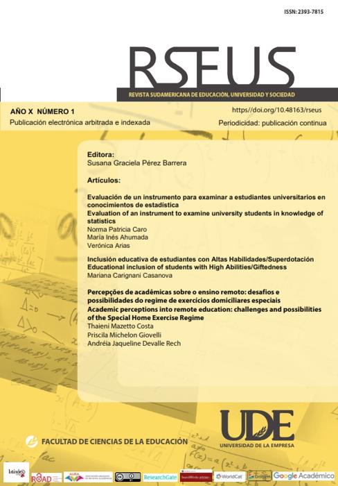 La Revista Sudamericana de Educación, Universidad y Sociedad es una revista de publicación continua dirigida a investigadores, profesionales, estudiantes, profesores y demás interesados. Su objetivo es contribuir con la divulgación del conocimiento y la innovación dentro de sus ejes temáticos, que son: Educación, Sociedad y Cultura; Gestión del conocimiento e Innovación educativa; y Políticas, gestión y calidad de la Educación.